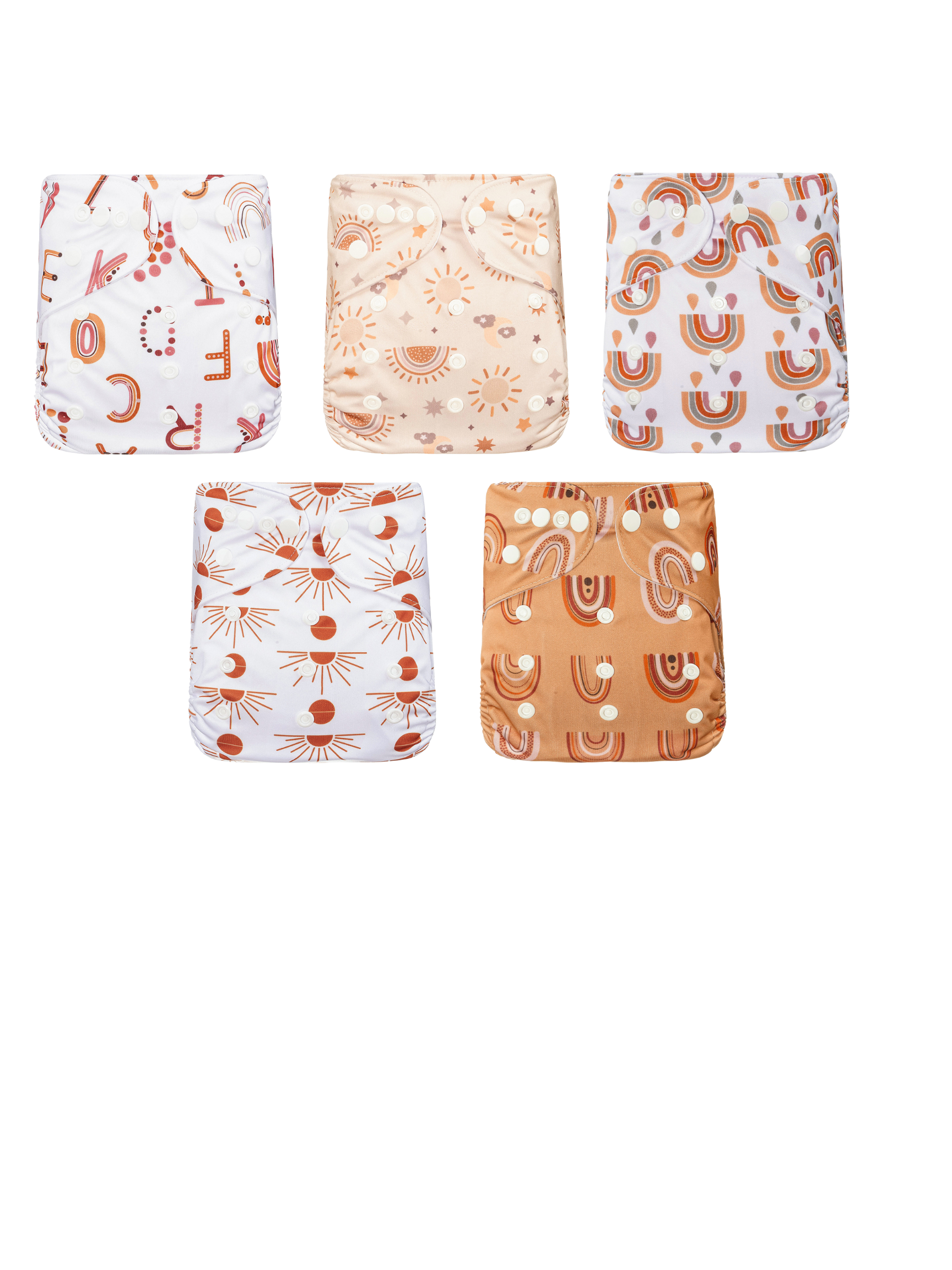 Experience the simplicity of our 5-piece set of cloth diapers, each adorned with unique brown designs on a solid background.