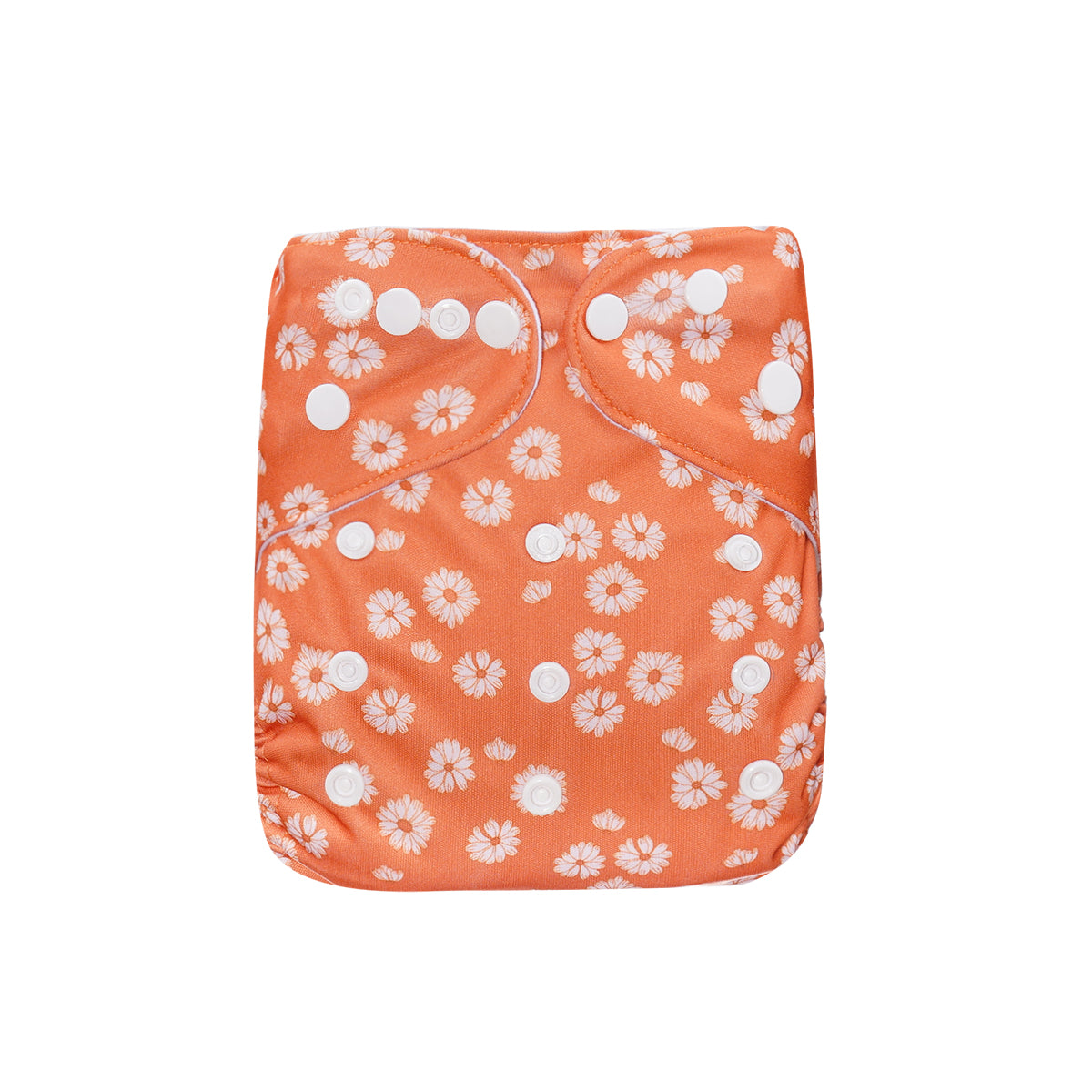 Easily adjust diaper snaps for a comfortable fit. Orange pumpkins and marguerite patterns add a charming touch.